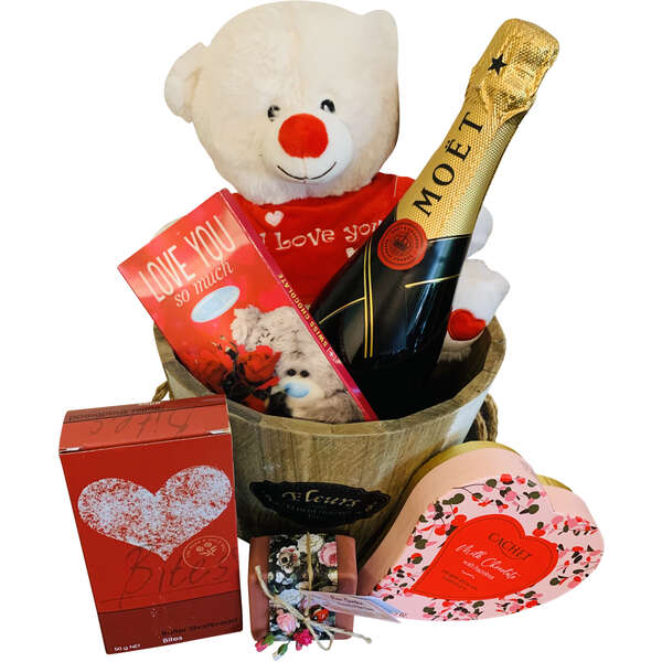 Our Moet Romance Celebration hamper arrives to the door is a Fluer wooden planter